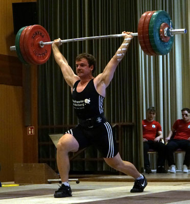 Sich selbst durch einen Flüchtigkeitsfehler im letzten Versuch des Stoßens brachte sich der Tagessieger Maksym Kara, der im Reißen eine neue Bestleistung (131 kg) ablieferte und im Stoßen dann im 3. Versuch die 155 kg schon ausgestoßen hatte um sie mit zu frühen Jubeln nach hinten ablegen mußte... sicher ist, daß ihm dies nicht noch einmal passieren wird, wie sein Coach Rolf Feser konstatierte.